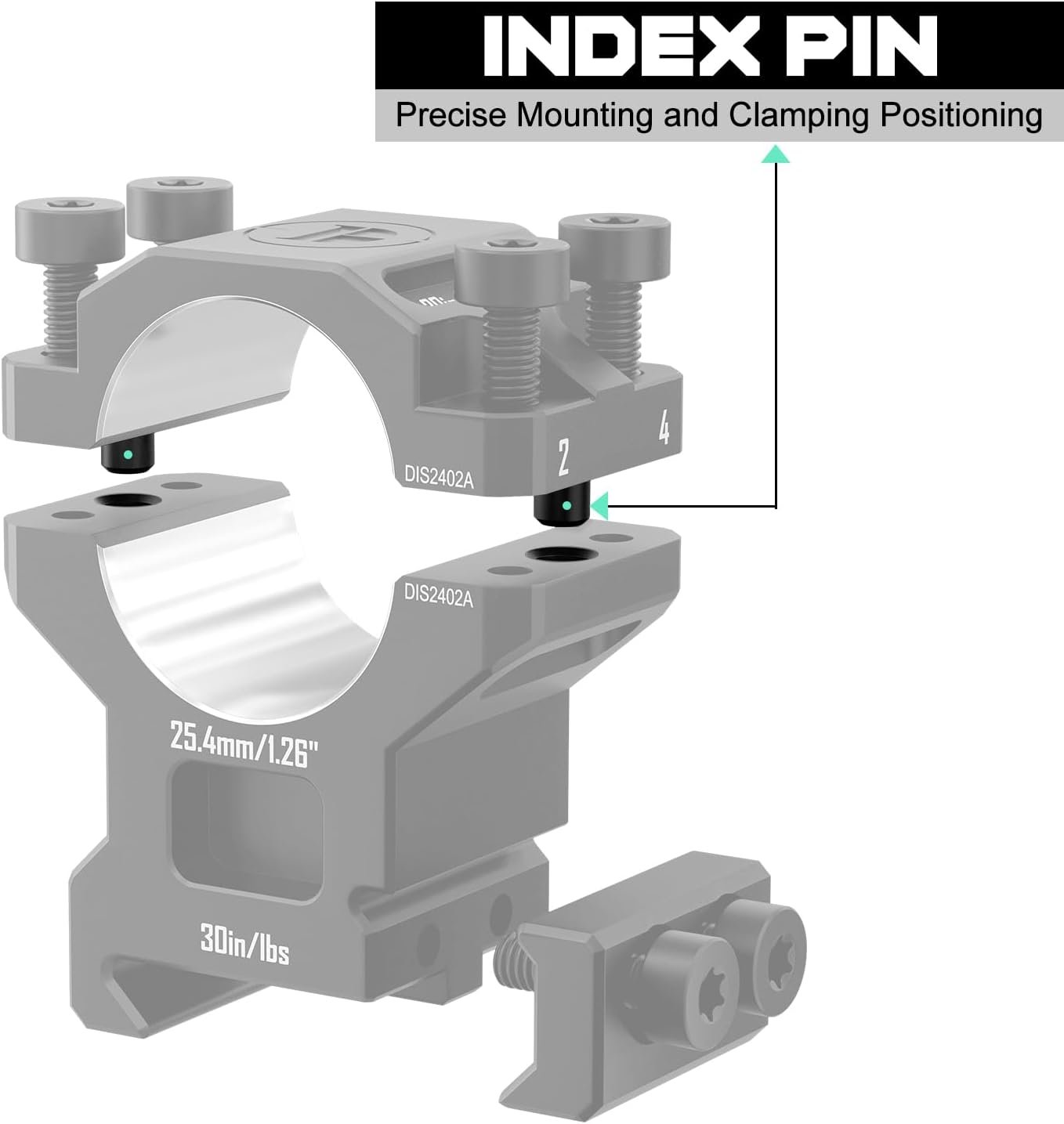 𝐈𝐧𝐝𝐞𝐱 𝐏𝐢𝐧 𝐒𝐭𝐮𝐝𝐬: For easy and precise mounting and clamping, scope mounts feature index pin studs on the upper cover. Torx screws contribute to incredible stability and secure mounting