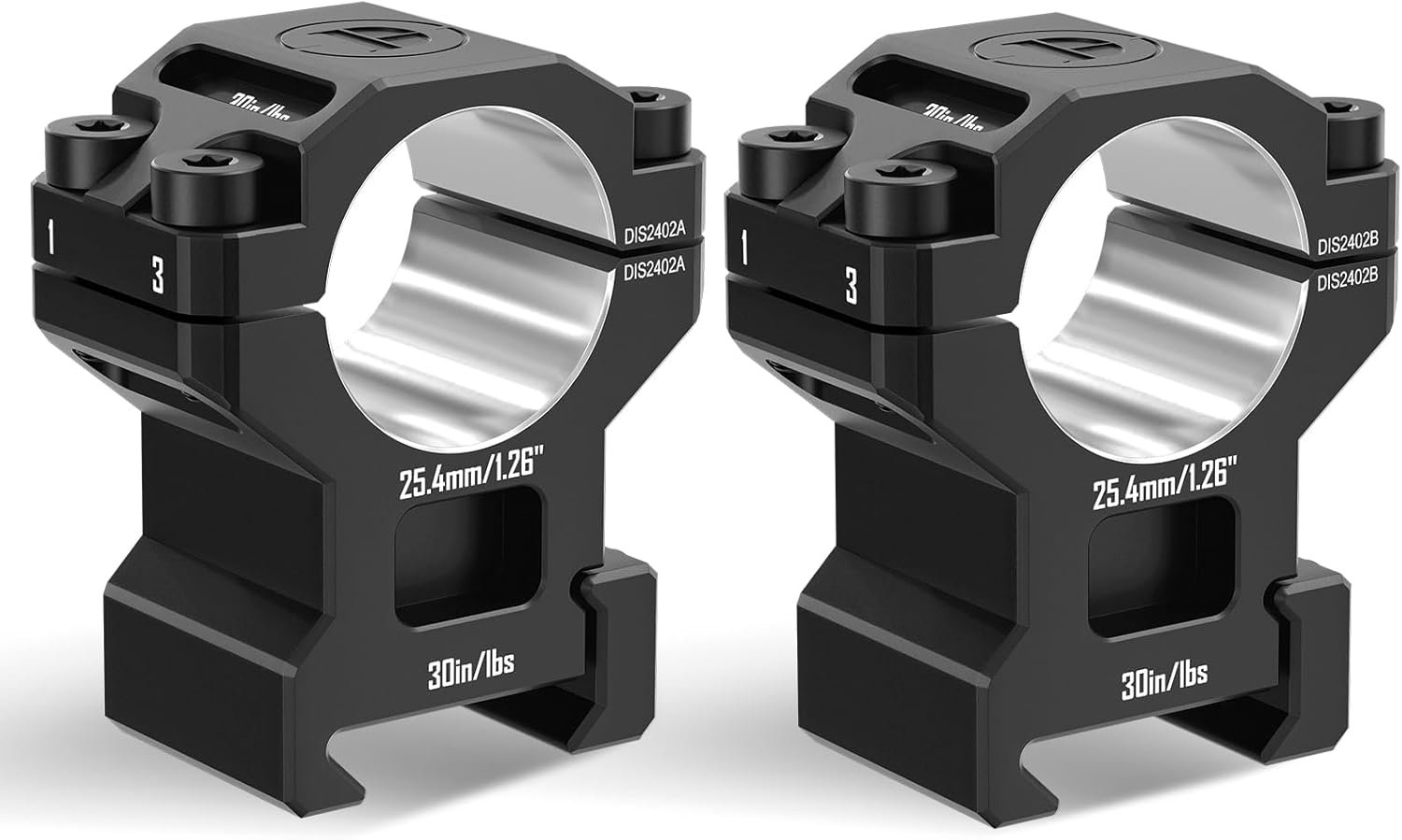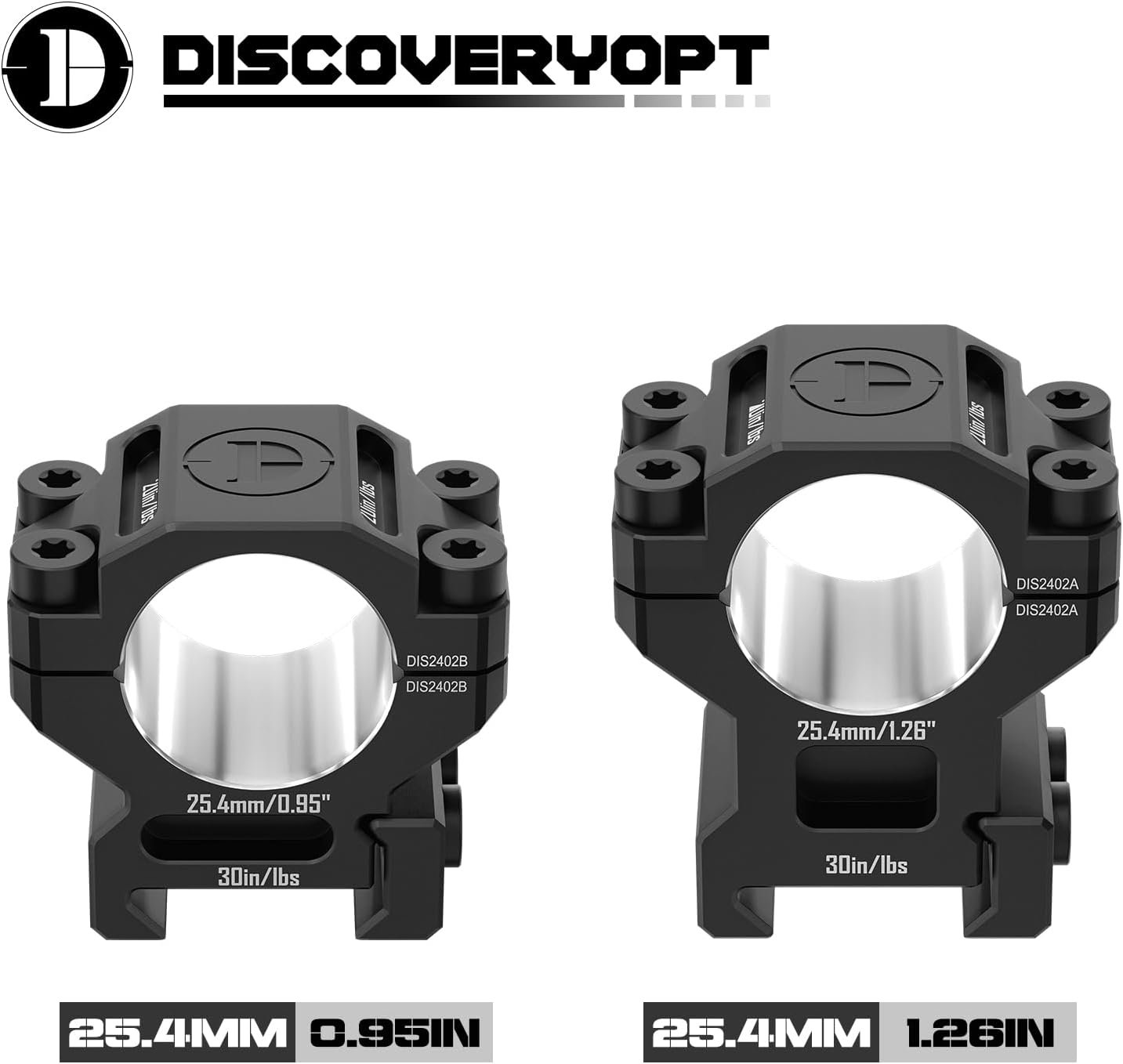 𝐒𝐩𝐨𝐫𝐭𝐢𝐧𝐠 𝐎𝐩𝐭𝐢𝐜𝐬 𝐌𝐨𝐮𝐧𝐭𝐬 & 𝐑𝐢𝐧𝐠𝐬: These 1″ Rings position the center of the riflescope tube at a height of 1.26inches (24.6 mm) from the base. Will only work with Picatinny spec mounts; they do not work with Weaver rails. Discoveryopt recommends max torque settings no greater than 20in/lbs for ring screws and 30in/lbs for base screws