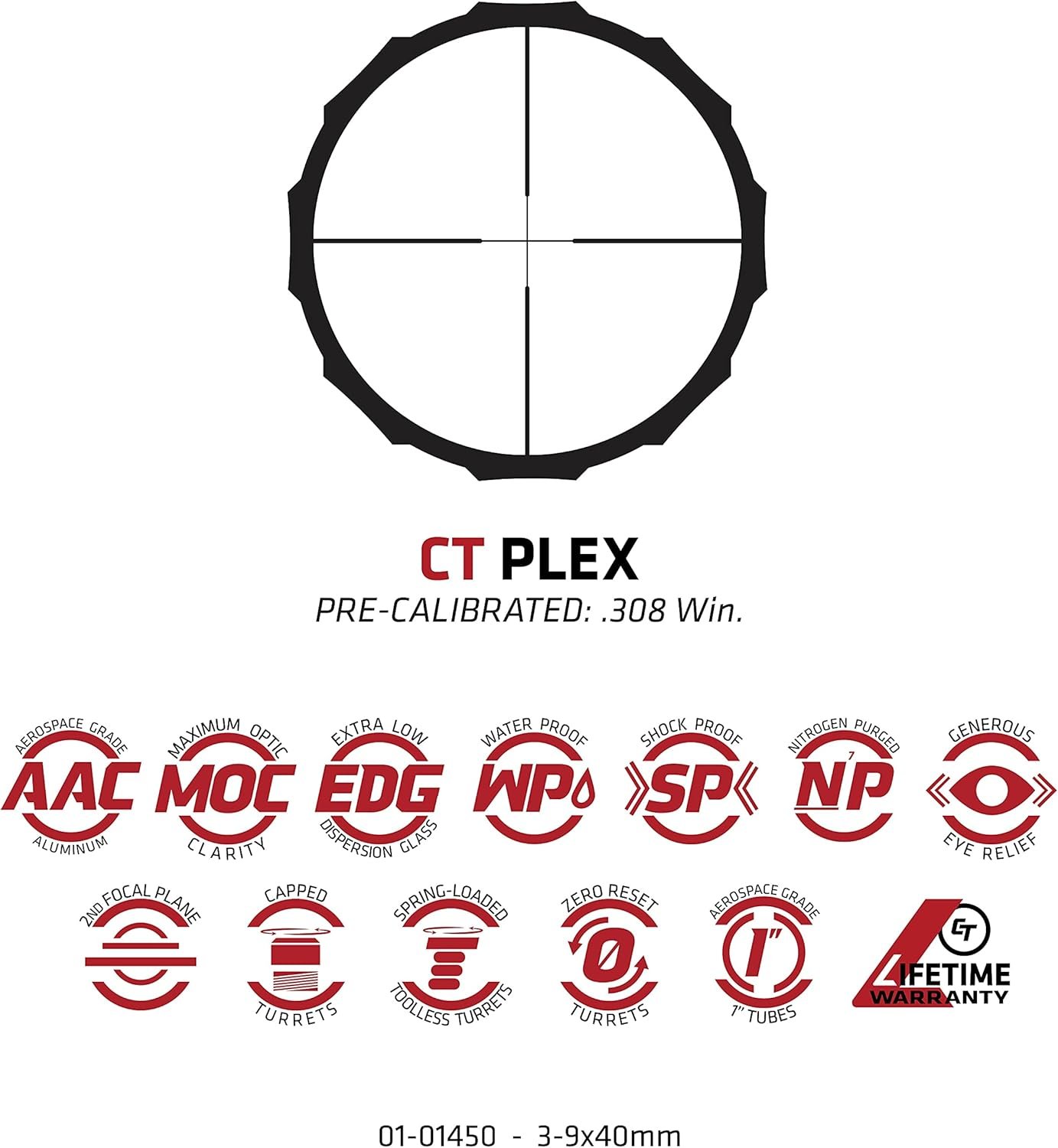 ACCURACY: Features a second focal plane, non-illuminated, CT Plex reticle with a 3.5″ eye relief, 1/4″ click value and quick spring-loaded zero reset capped turrets