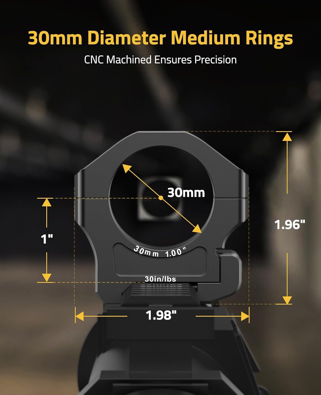 Scope Tube Diameter 30mm Ring Center Height 1.00 inches | Medium Profile Ring Width 0.97 inches Ring Screws Torque No More than 18 in/lbs Base Screws Torque No More than 30 in/lbs Weight per Ring 2.42 oz Material 7075 Aerospace-grade Aluminum Finish Type III Hard Anodized Matte Black Compatibility Compatible with Picatinny Base Includes Scope Ringsx2, Wrenchx1, T25 Torx Screws per Ring x6, Additional Screws x4