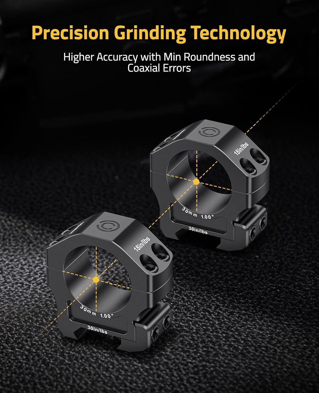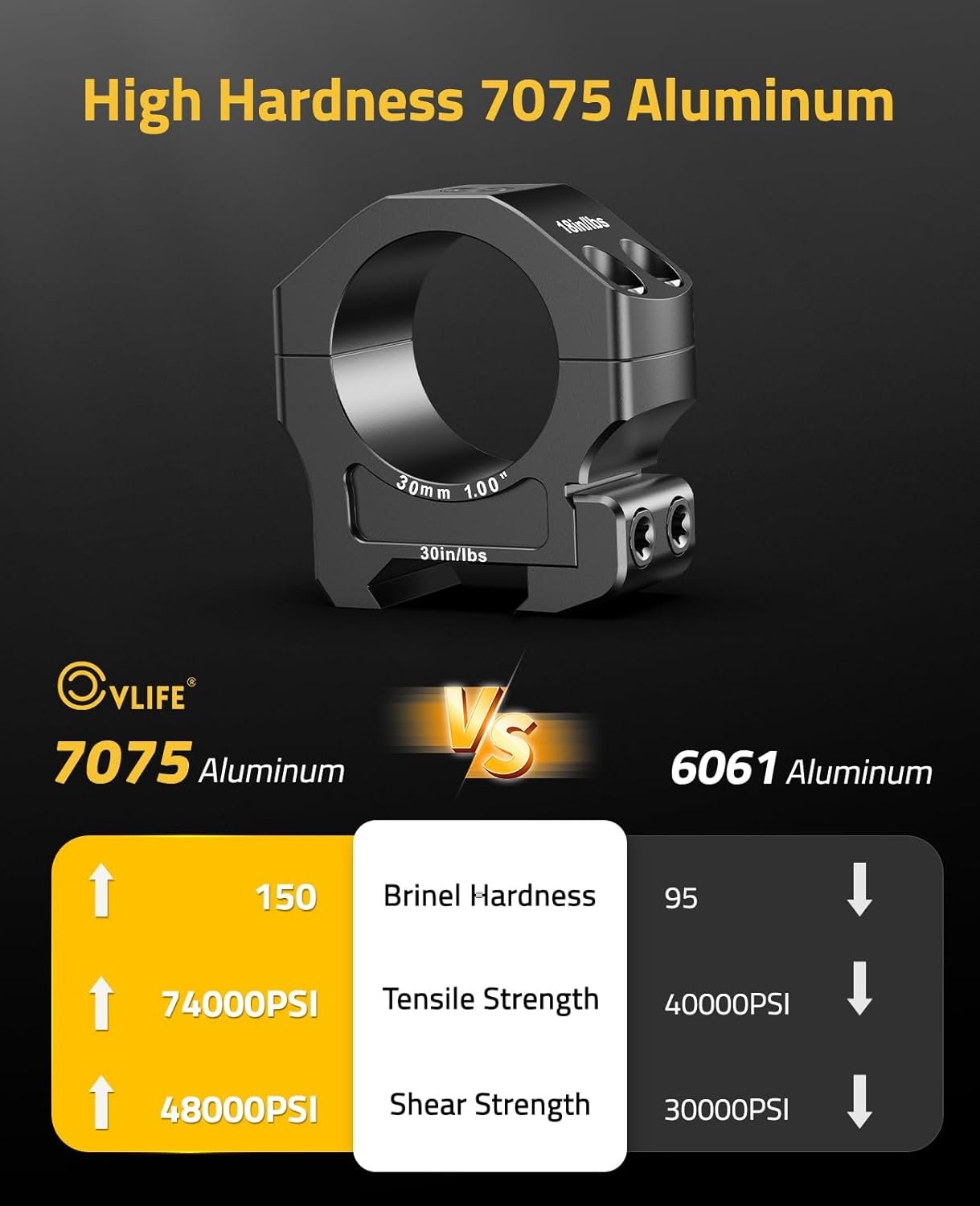 Aerospace Grade 7075 Aluminum Construction: Precision CNC-machined scope rings from 7075 grade aluminum alloy, which boasts superior strength and enhanced corrosion resistance properties