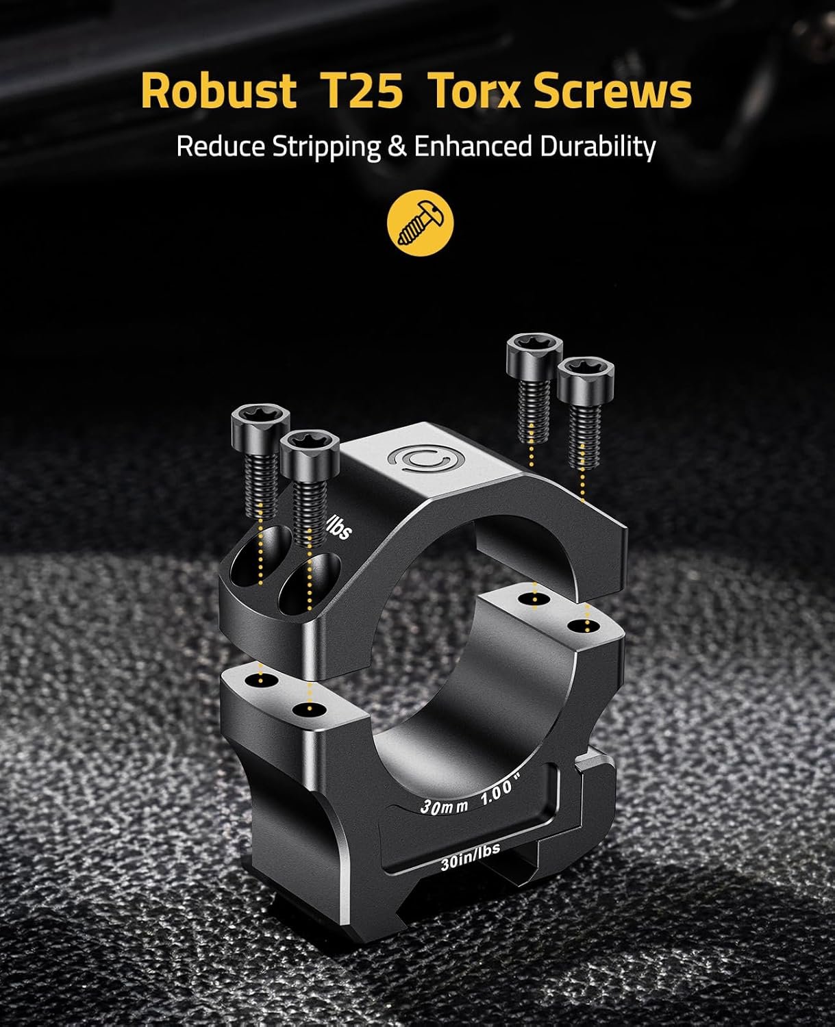 High-strength Torx Screws: Quickly tighten the ring and bring amazing stability. Two T-25 Torx screws on each side provide a secure installation for all 30mm tube scopes