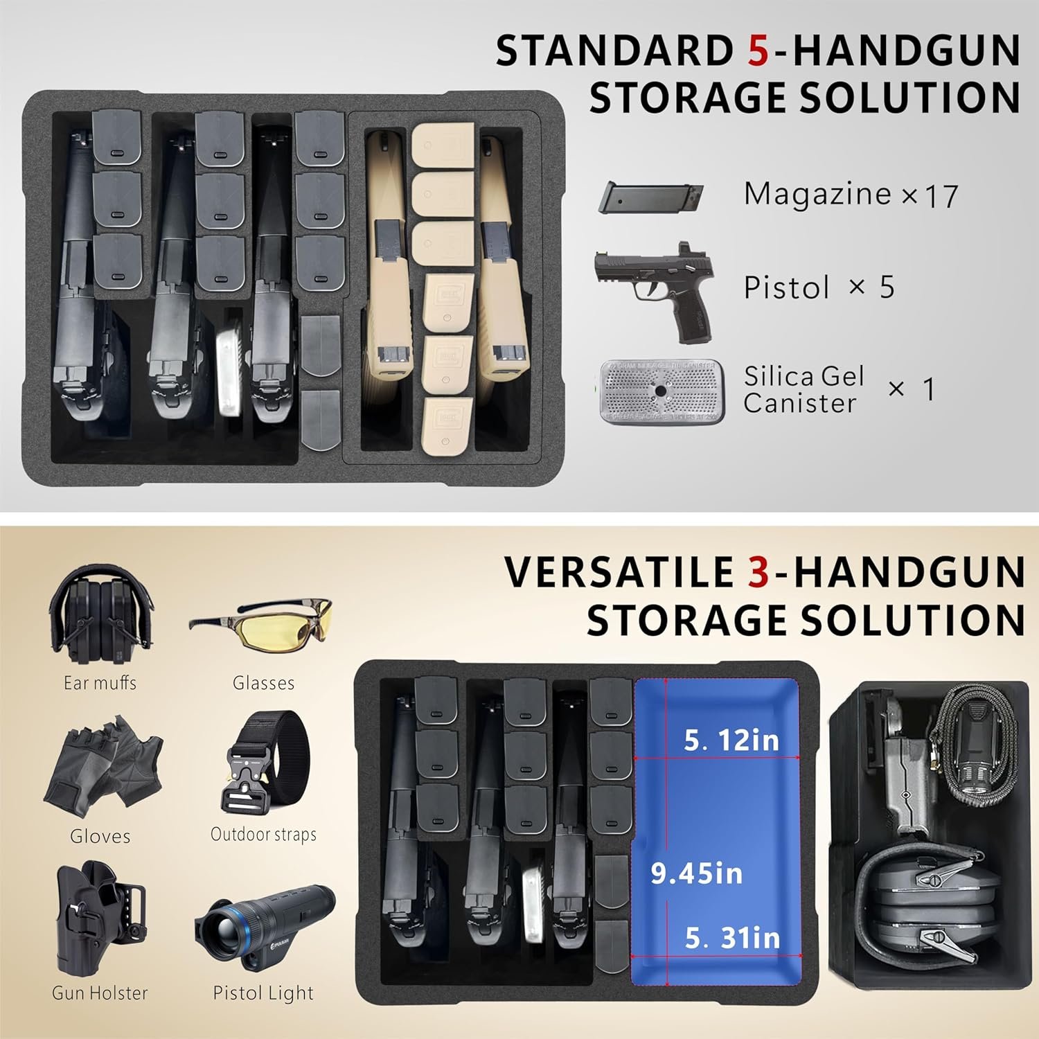 𝗨𝗹𝘁𝗶𝗺𝗮𝘁𝗲 𝗙𝗹𝗲𝘅𝗶𝗯𝗶𝗹𝗶𝘁𝘆 𝘄𝗶𝘁𝗵 𝗠𝗼𝗱𝘂𝗹𝗮𝗿 𝗗𝗲𝘀𝗶𝗴𝗻 – Unlock the ultimate in flexibility with our modular pistol case — capable of holding up to 5 handguns and 17 magazines. Designed to adapt to your changing storage needs, it easily converts from a full 5-handgun setup to a 3-handgun plus accessories layout by removing the modular inserts. Free up space for ammo, safety gear, or other essentials with just a quick adjustment. Two configurations for the price of one — perfect for every shooter, whether you’re at the range or on the go.