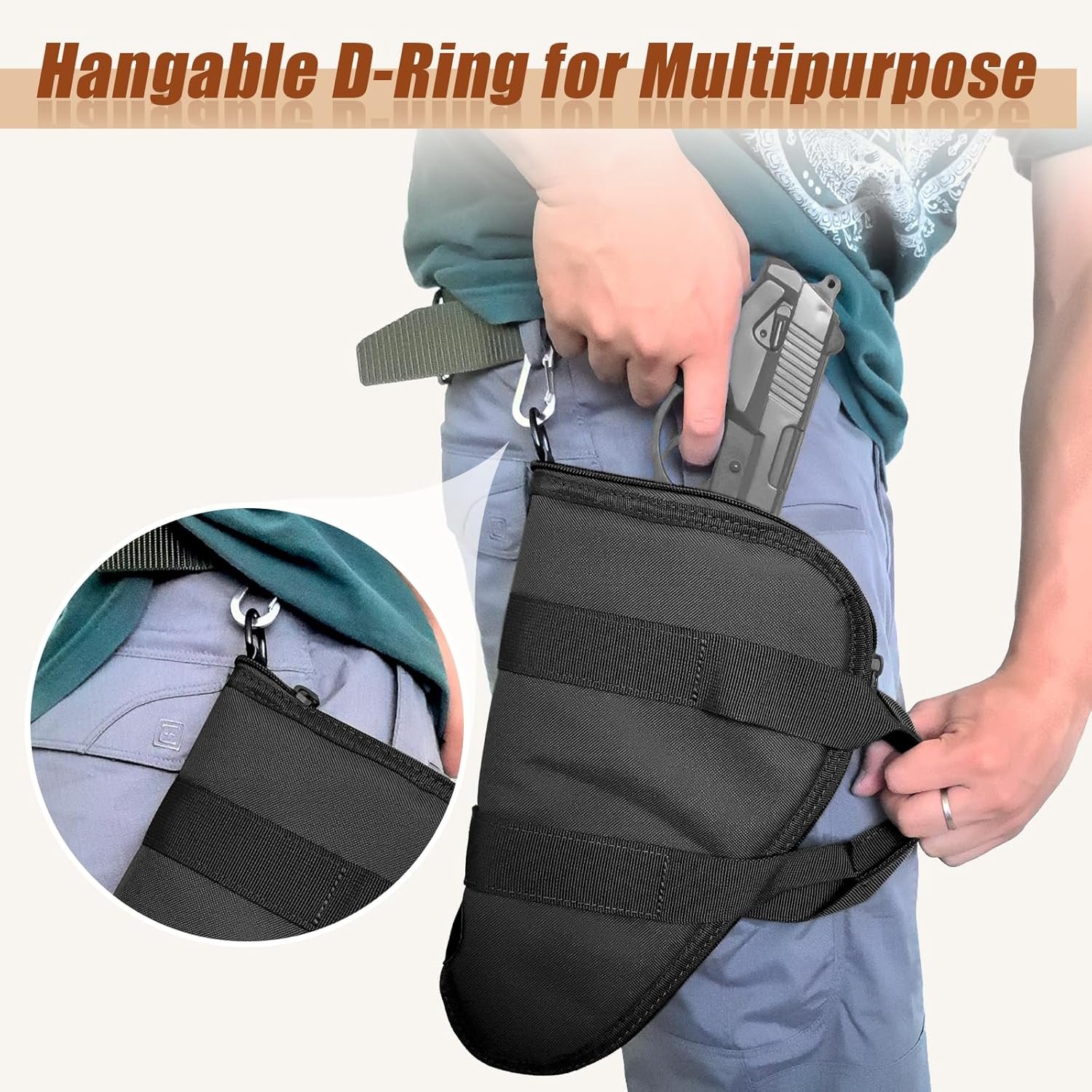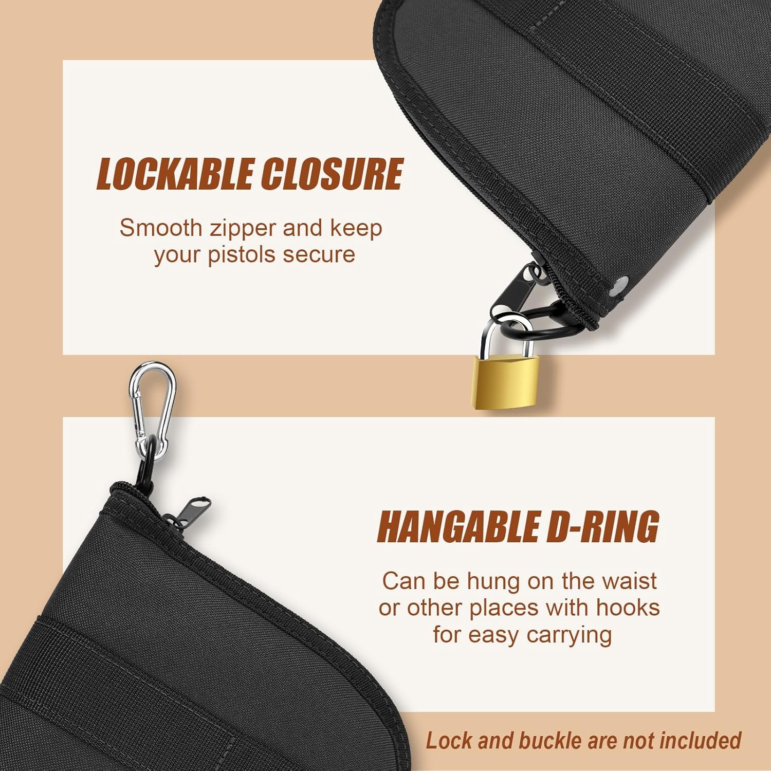 【Lockable Pistol Case】Full-length external zipper for quick and easy access, D-ring and zipper with locking feature for reliable security.