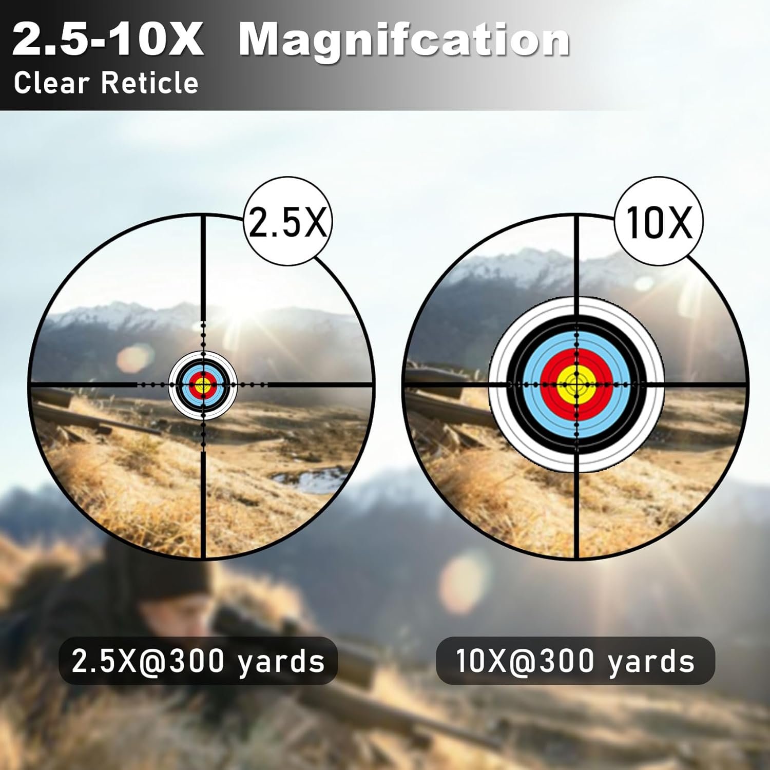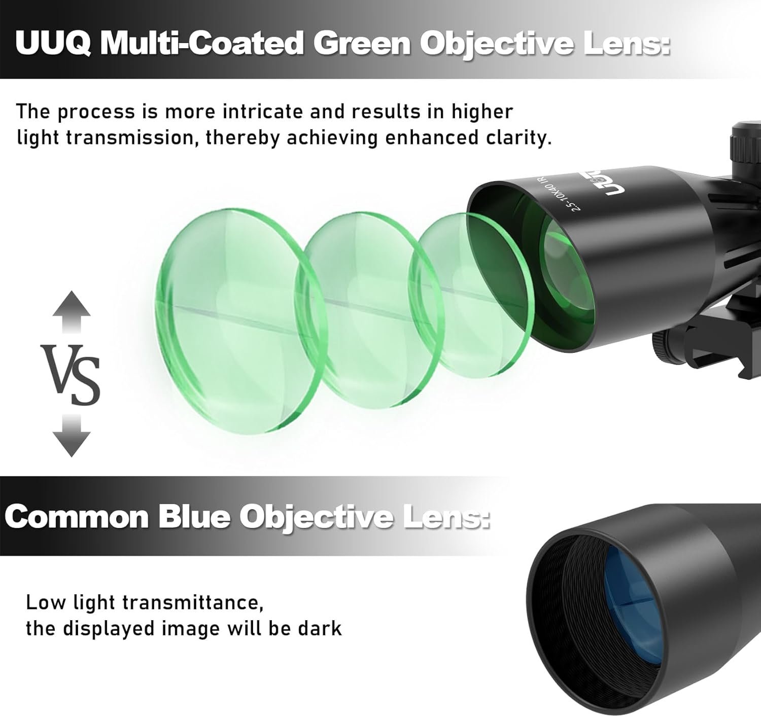✔【Upgraded Multi-coated Green Lens and Clear】:The multi-layer green coating of the UUQ 2.5-10×40 rifle scope provides a bright, clear, and vivid view, making targets easy to identify. It reduces light scattering and reflection, ensuring image clarity and maintaining clear visibility of the range. Whether in bright or low-light conditions, it performs exceptionally well.