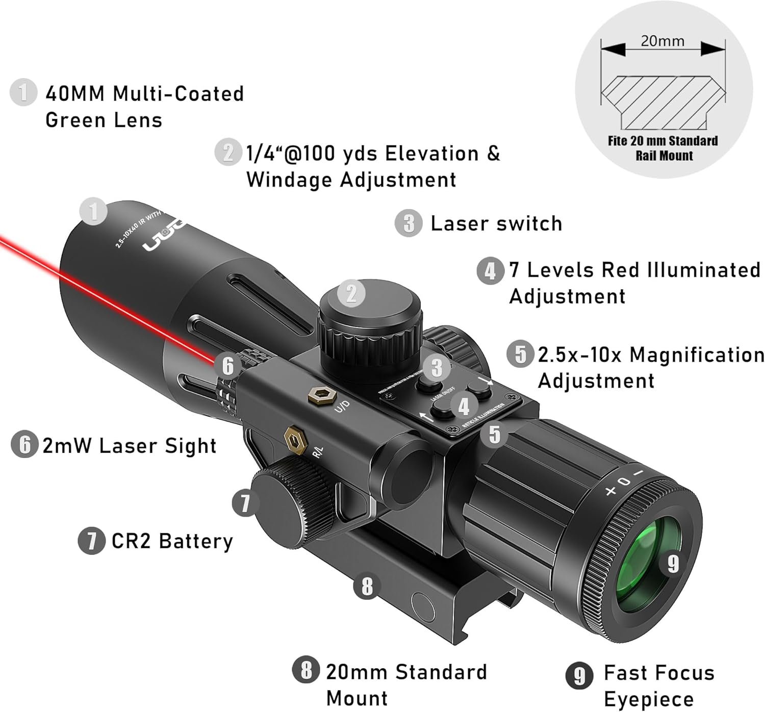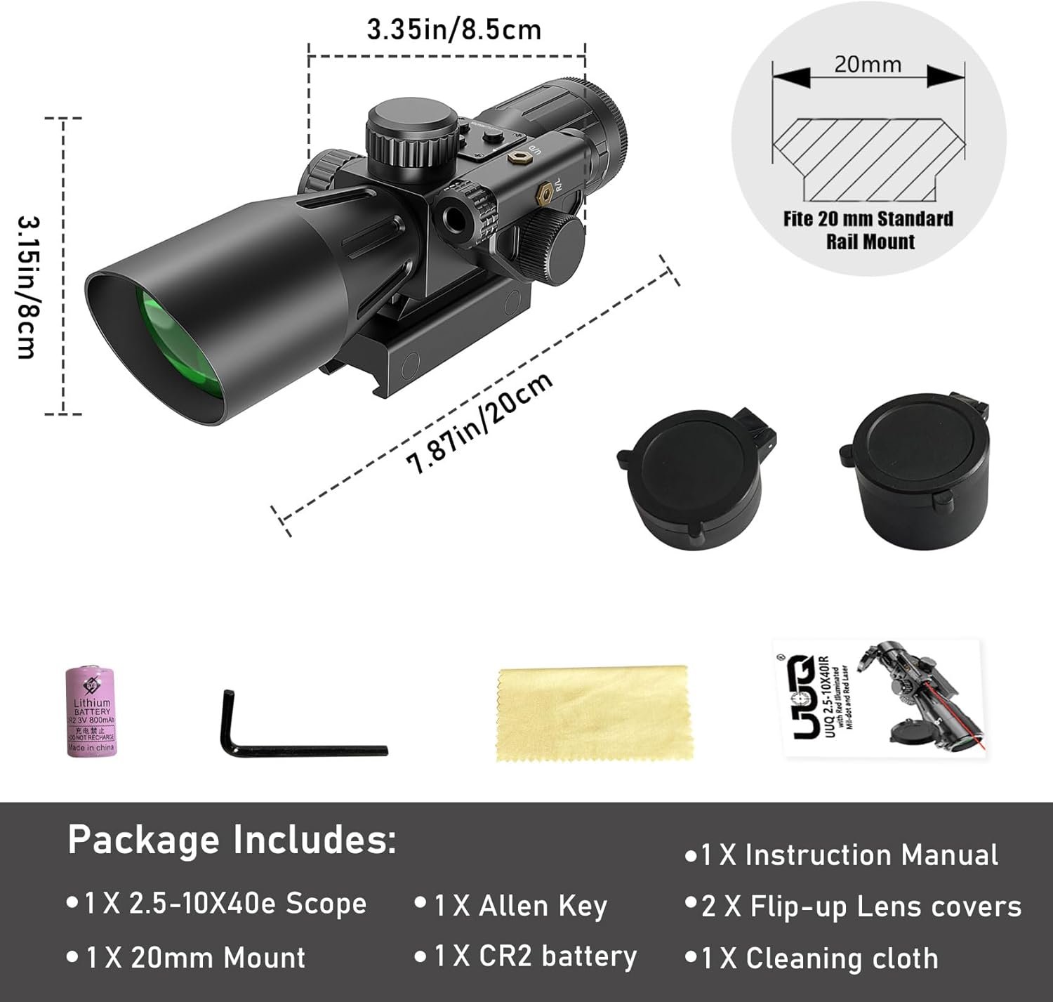 ✔【Packaging and Customer Service】:The package includes a 2.5-10×40 rifle scope, Flip-up lens covers, CR2,cleaning cloth, wrenches, and user manual. UUQ is your best choice, providing you with perfect and rapid service to solve any of your concerns.