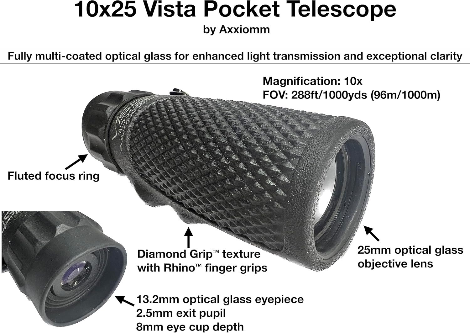 10x magnification — 25mm optical glass objective (front) lens — 13.2mm optical glass eyepiece — 2.5mm exit pupil — 8mm soft eyecup — 4.25″ length