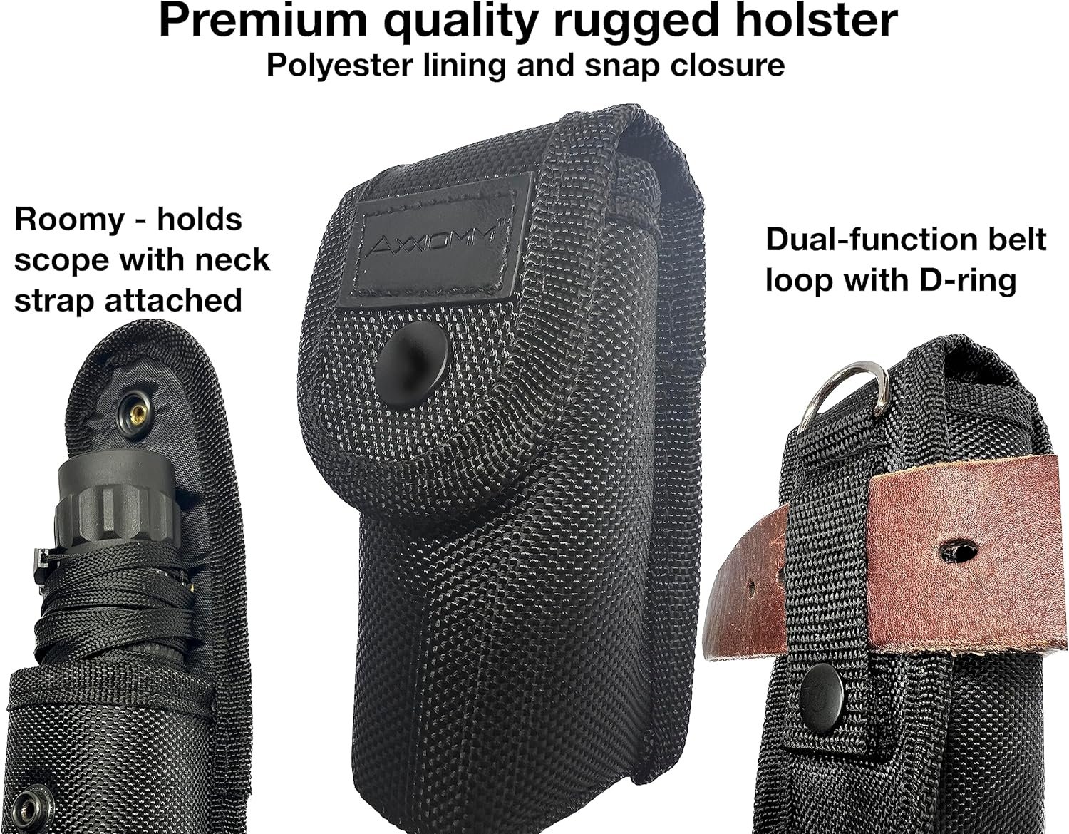 Premium quality rugged holster with polyester lining, 2-function belt loops (snap and thread-thru) & D-ring
